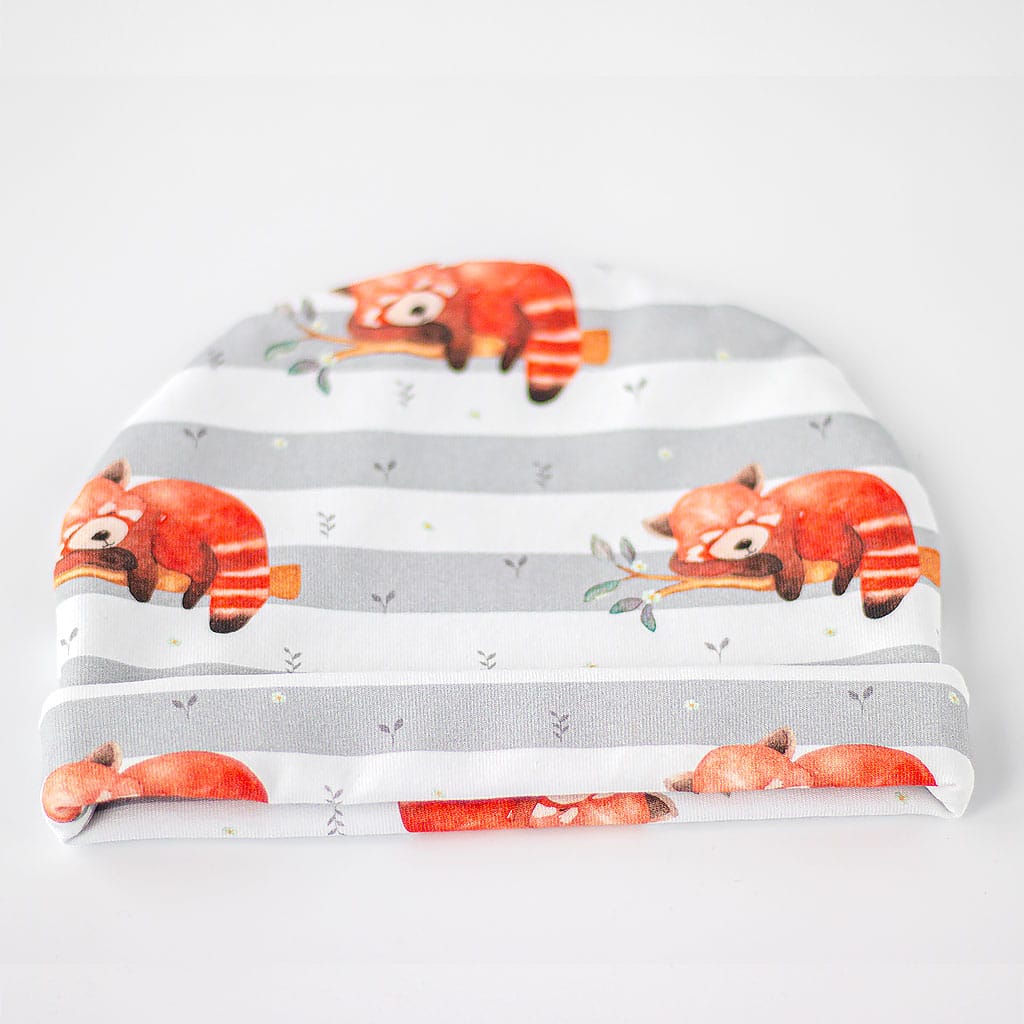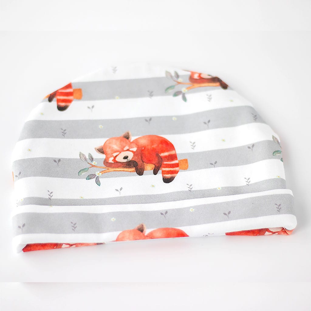 Babyset „roter Panda“ – Biojersey-Mütze & handgestrickte Merinosöckchen