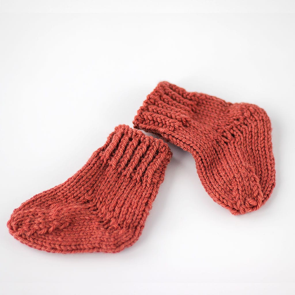 Die handgestrickten Söckchen aus reiner Merinowolle passen farblich perfekt dazu und halten kleine Füßchen warm, ohne zu überhitzen. Merinowolle ist temperaturausgleichend, atmungsaktiv und wunderbar weich – ideal für die empfindliche Babyhaut.