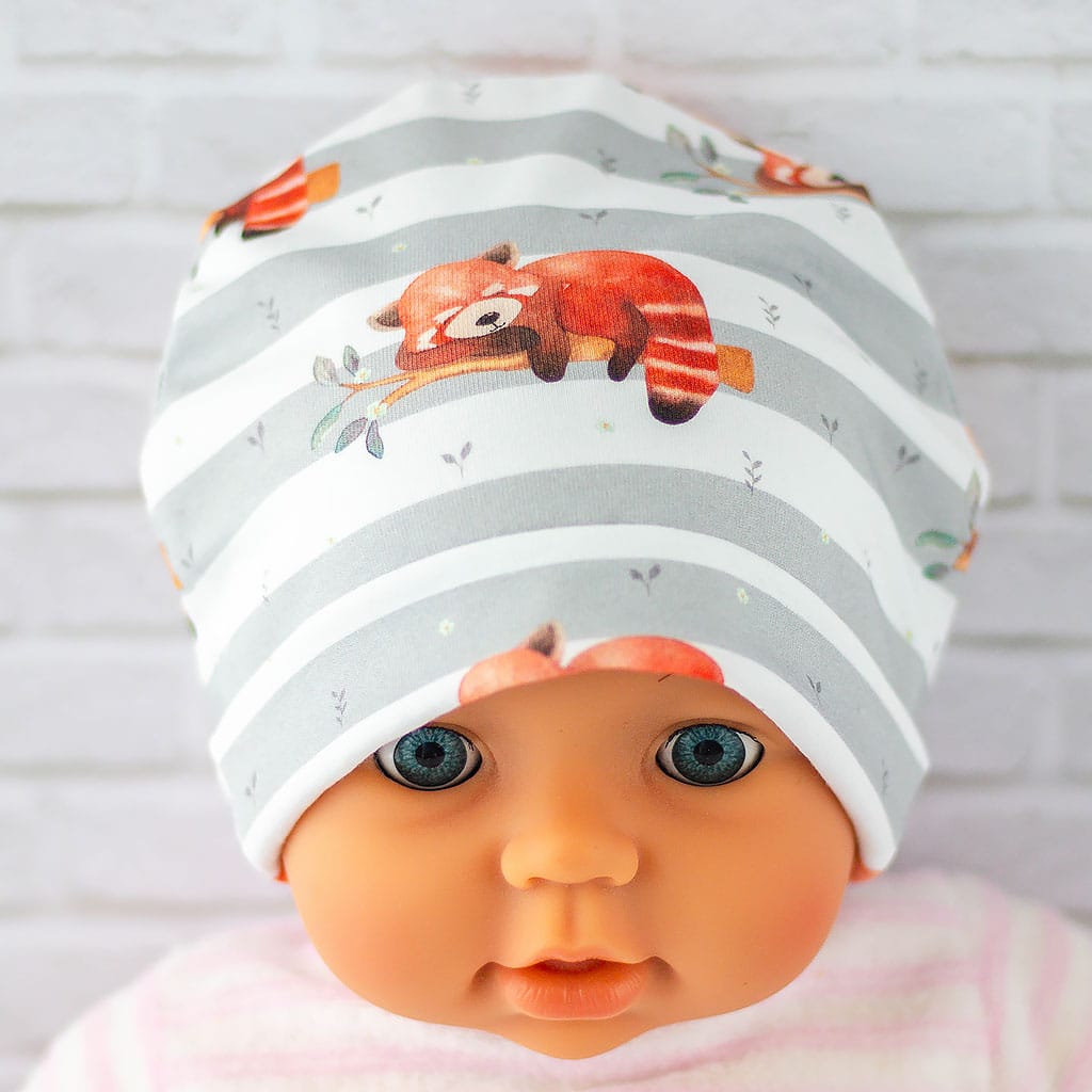 Die Mütze aus zertifiziertem Biojersey ist weich, dehnbar und angenehm auf empfindlicher Haut. Sie wurde speziell für Neugeborene entworfen und hält das Köpfchen kuschelig warm. Das verspielte Panda-Motiv mit sanften Grautönen und einem Hauch Rot macht sie zu einem echten Lieblingsstück.