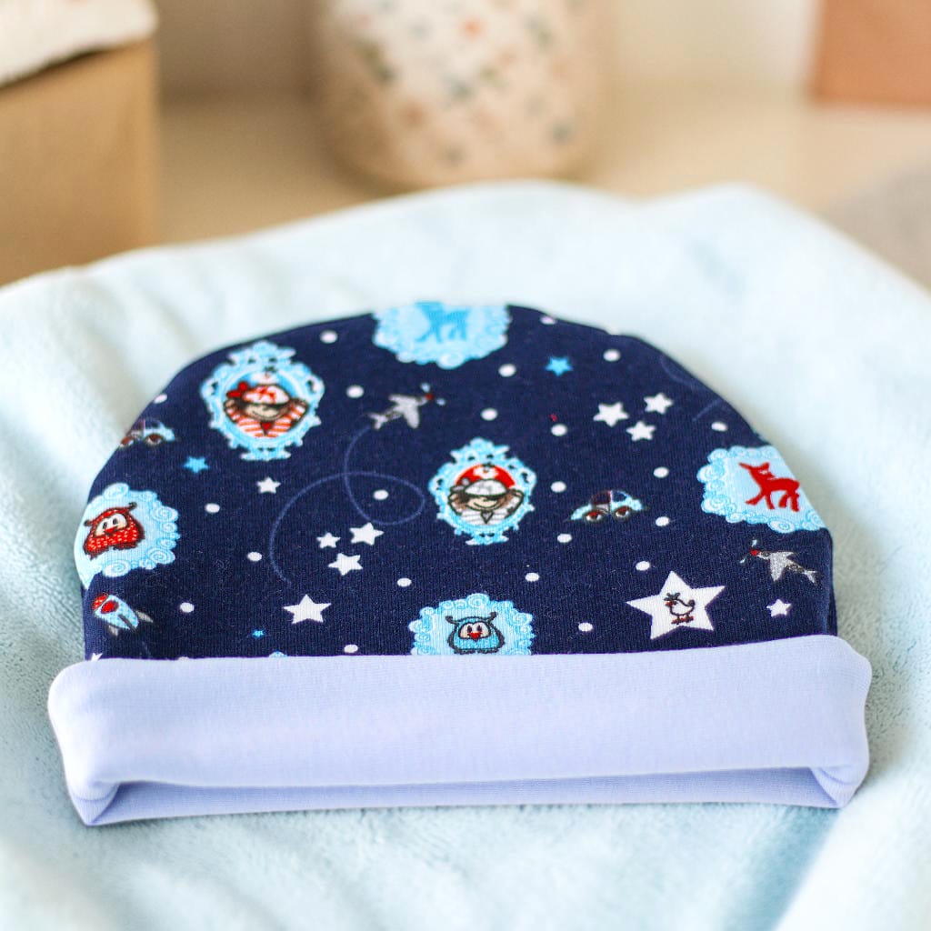 Die Mütze ist mit hellblauem Sommersweat gefüttert. Sie schützt das empfindliche Köpfchen in den ersten Lebenstagen zuverlässig vor Zugluft und sitzt angenehm, ohne einzuengen.