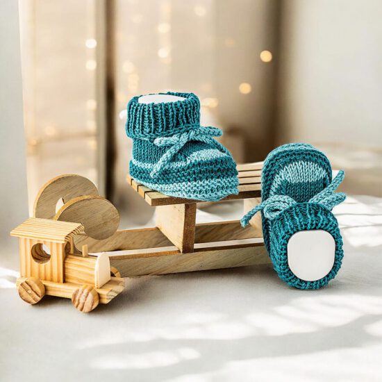 Handgestrickte Babyturnschuhe aus 100 % Merinowolle in hellen und dunklen Petroltönen. Weich, temperaturregulierend und mit Kordel für sicheren Halt. Ein stilvolles Geschenk zur Geburt, Taufe oder fürs Fotoshooting.