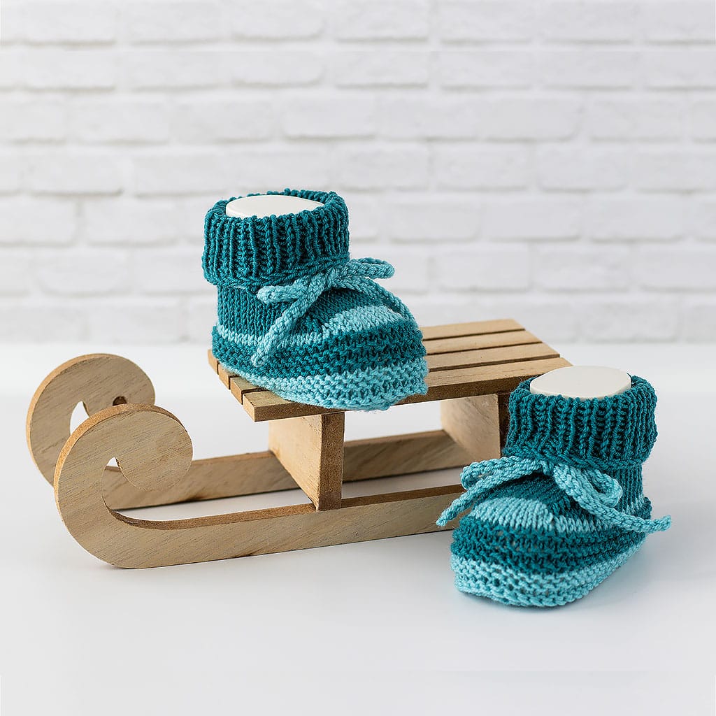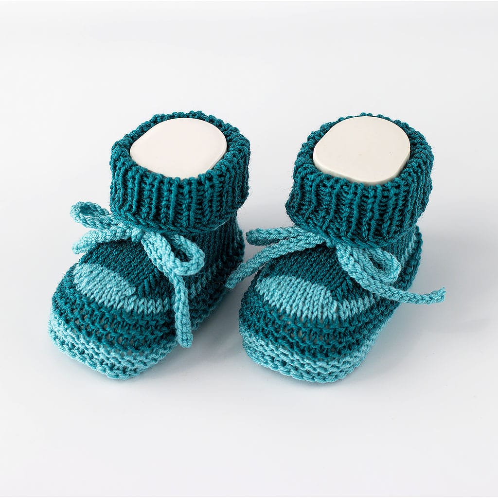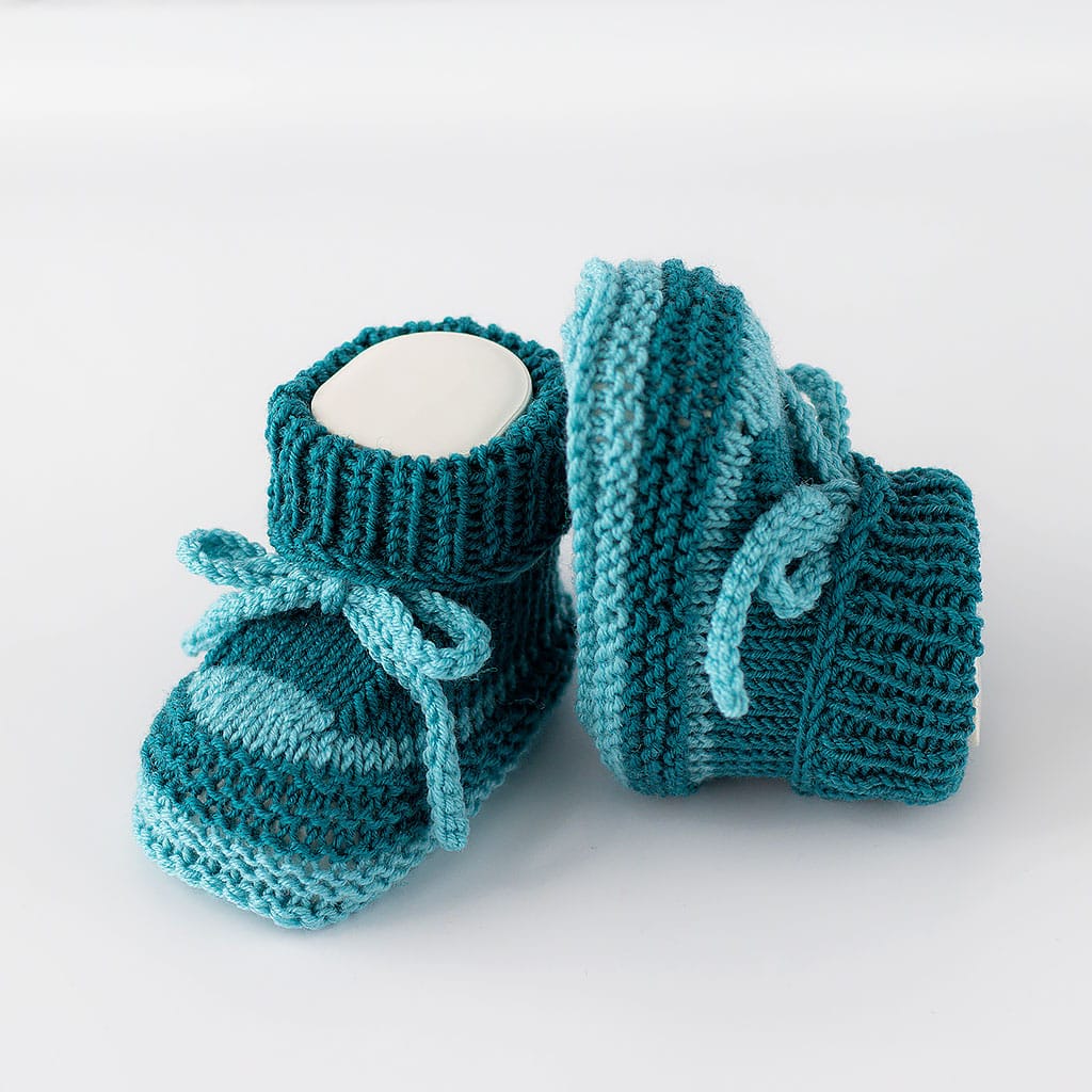 Babyturnschuhe aus Merinowolle gestrickt in petrol Tönen