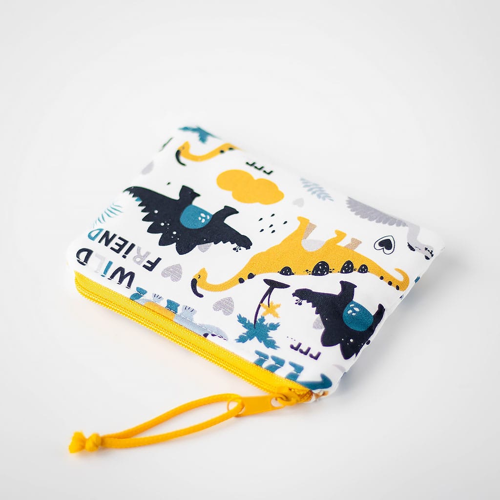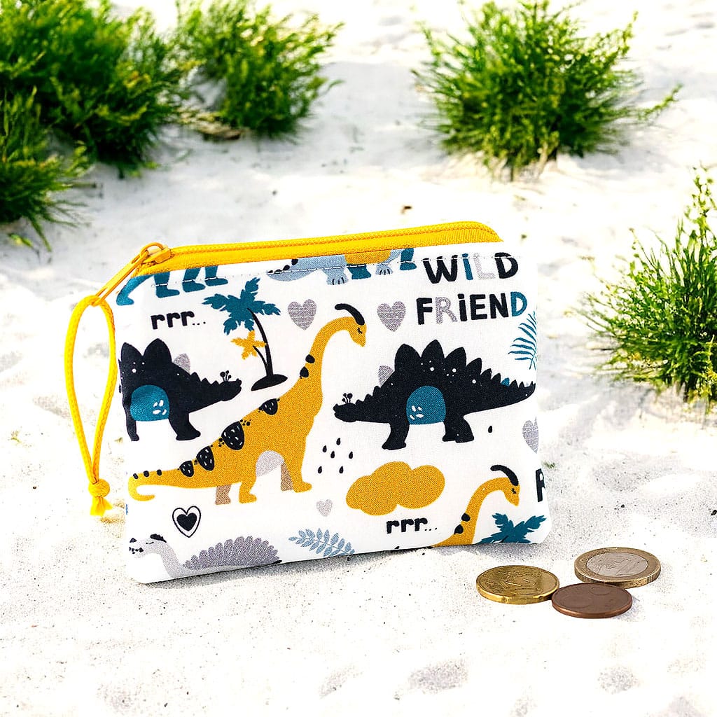 Coole Kinder-Geldbörse mit farbenfrohen Dino-Motiven aus 100 % Baumwolle. Sicherer Platz für Taschengeld und kleine Schätze – ideal für Kindergarten und Schule.