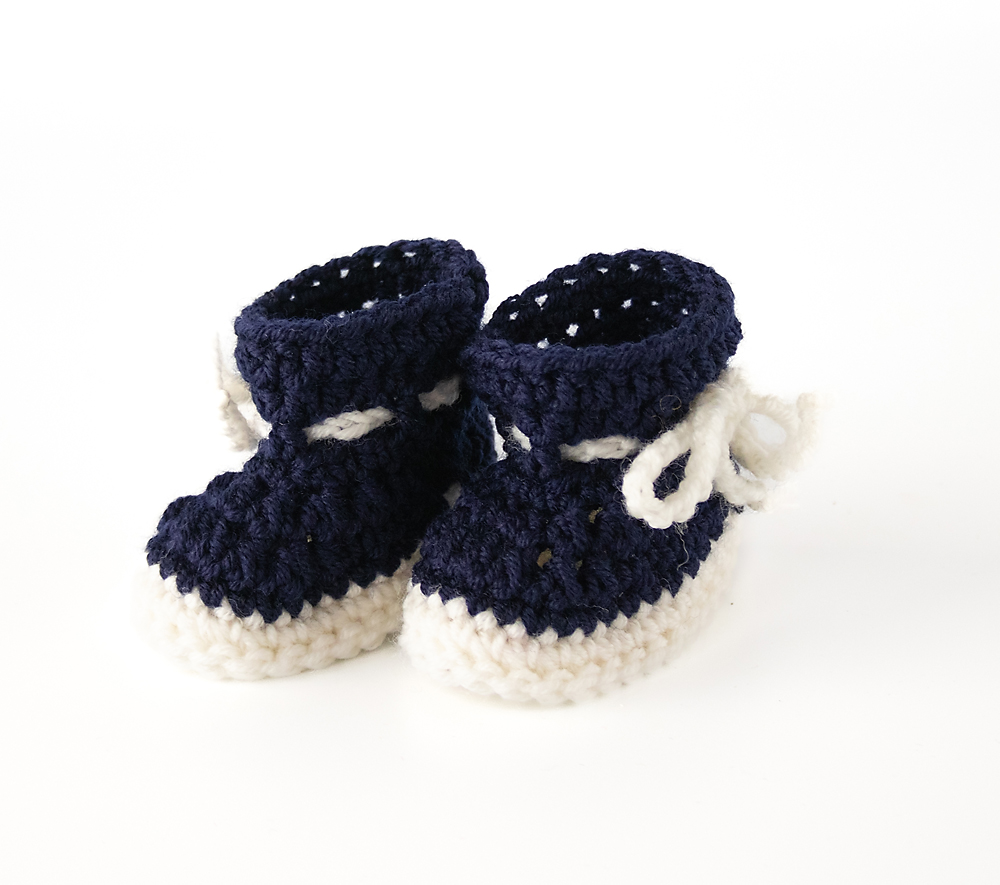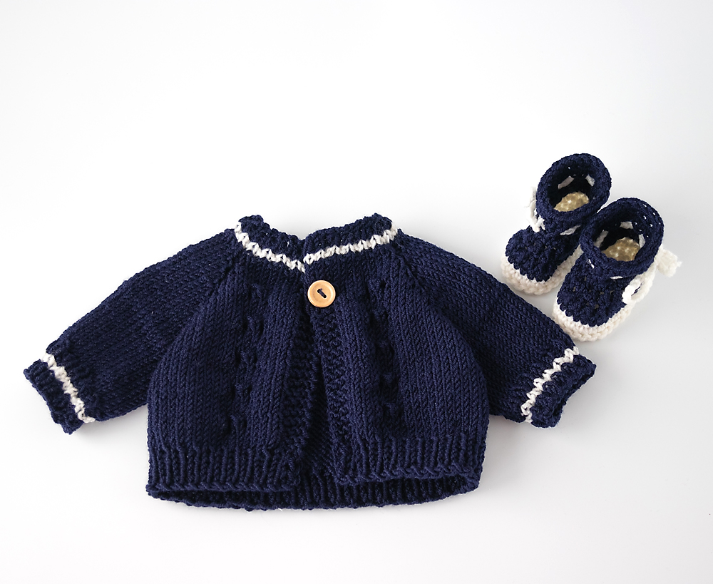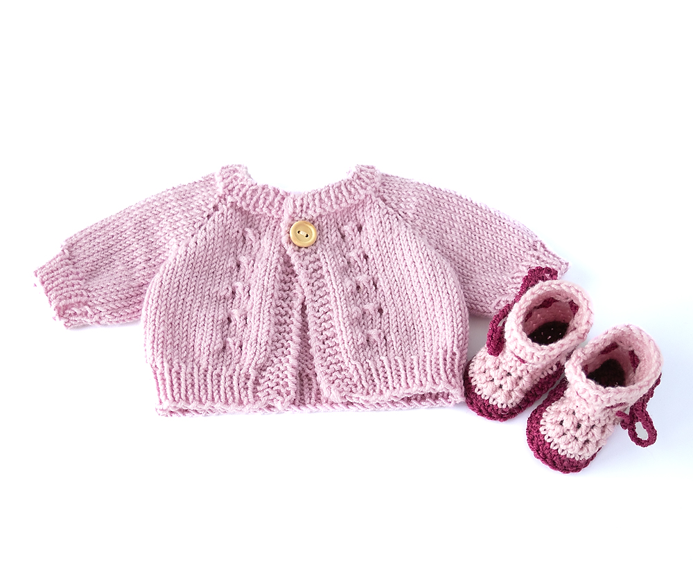Die Jacken in Blau oder Flieder sind im Vorderbereich mit einem zarten Lochmuster gearbeitet und werden mit nur einem Knopf geschlossen – ideal, damit kleine Hände das An- und Ausziehen selbst üben können. Die Schuhe werden einfach über die Füße gezogen und mit einem Band fixiert, sodass sie sicher sitzen und nicht verrutschen.