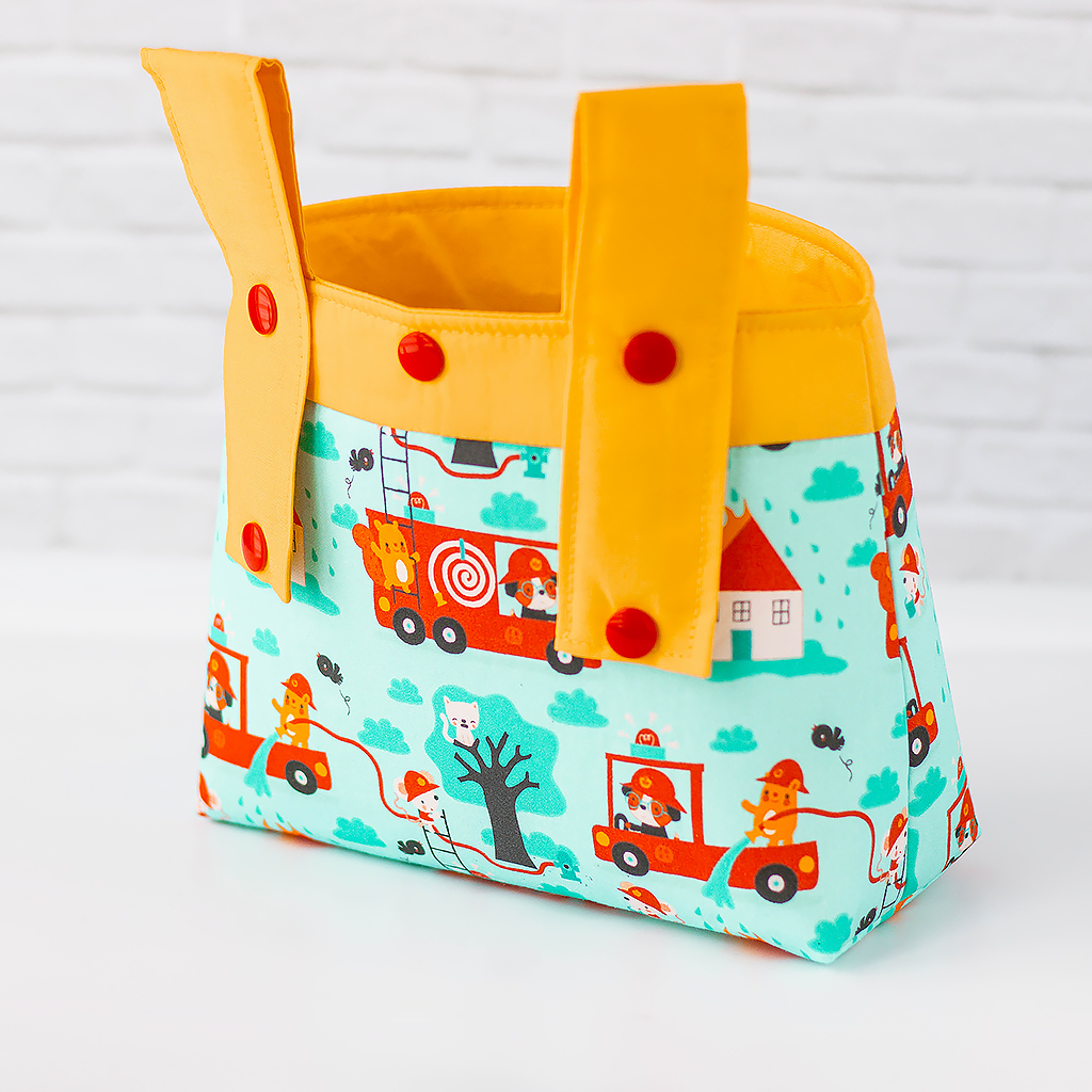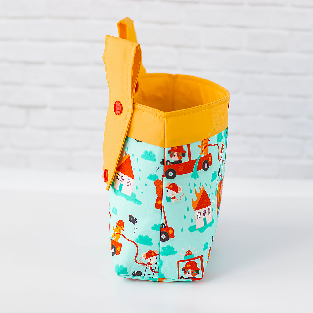 Das lebendige Stoffdesign zeigt mutige Hunde als Feuerwehrleute, die mit ihren Feuerwehrautos im Einsatz sind. Die frischen Farben in Türkis, Rot und Gelb machen die Tasche zu einem fröhlichen Blickfang am Kinderfahrrad, Laufrad oder Roller.