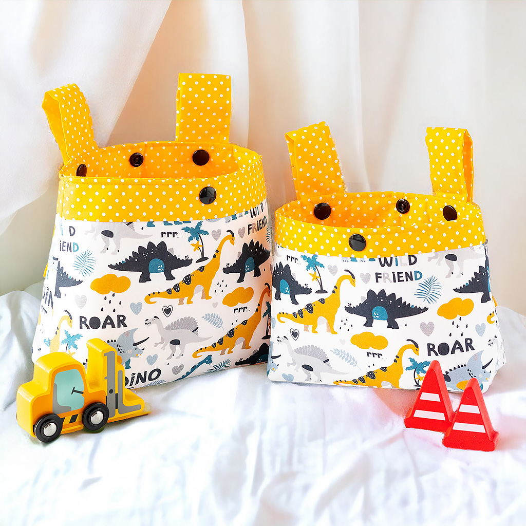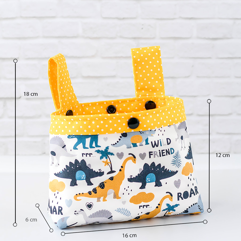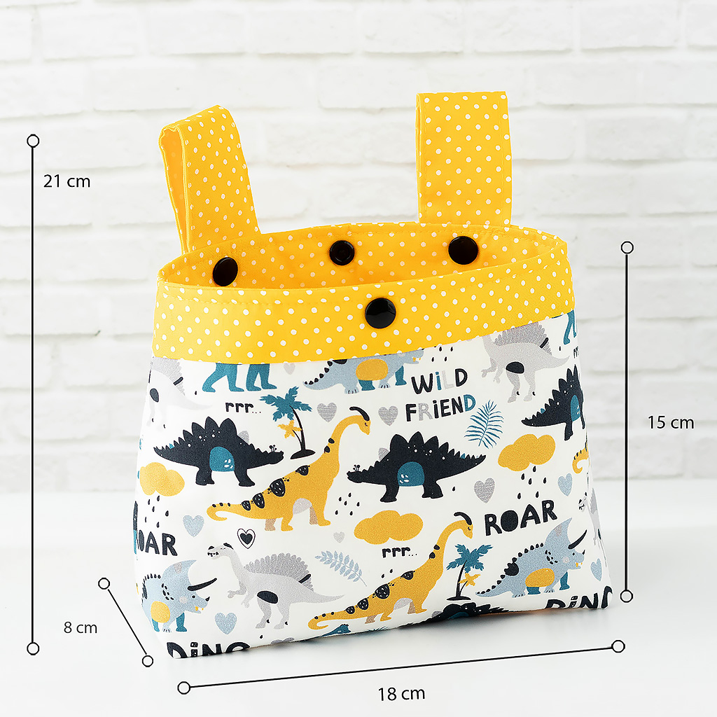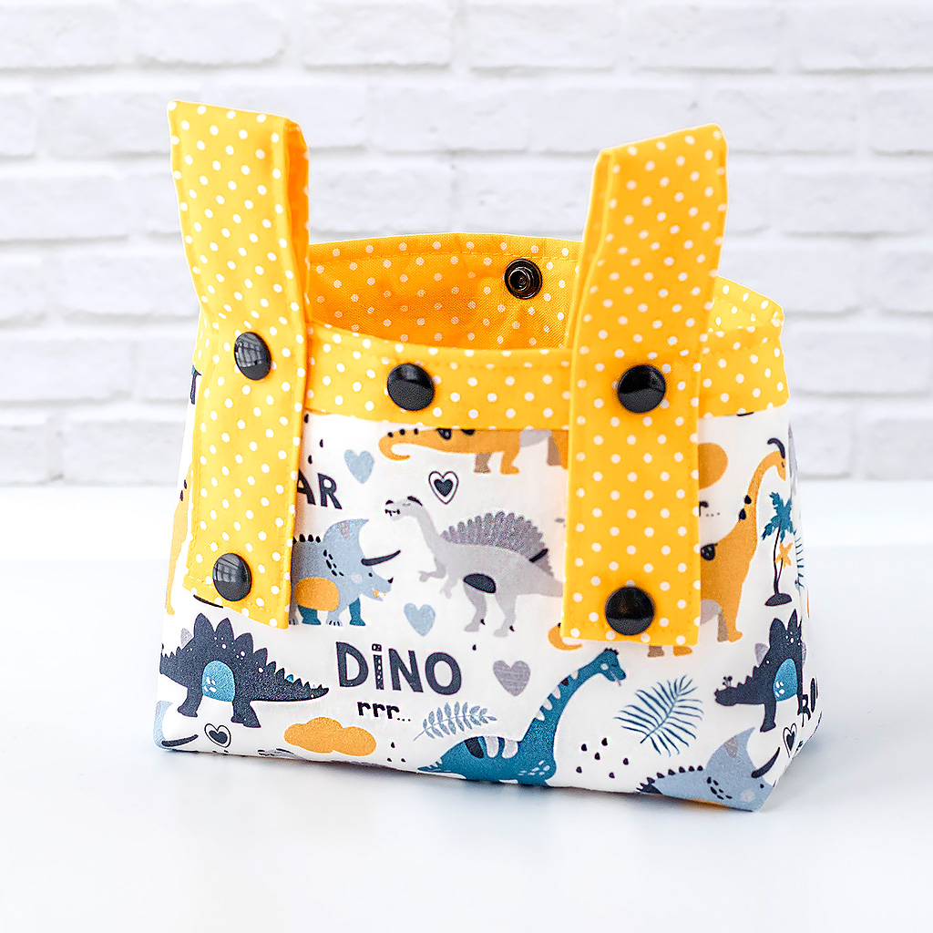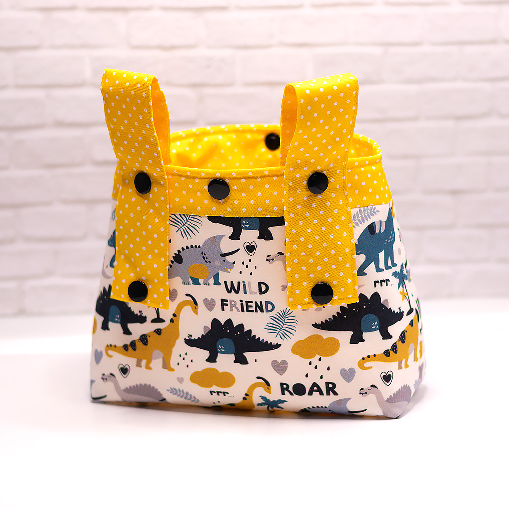 Stoff: Außenstoff weiß mit Dino Friends, der Futterstoff ist sonnengelb mit weißen Punkten.