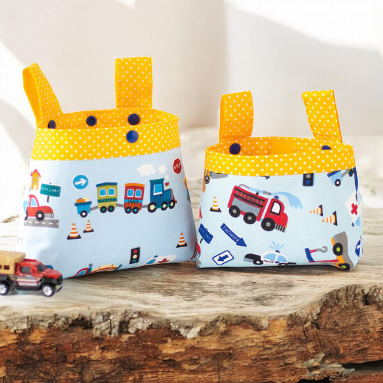 Praktische Lenkertasche für Kinder aus Baumwolle mit Auto- und Zugmotiv – ideal für Laufrad oder Kinderfahrrad, durchdacht verarbeitet und leicht zu handhaben.