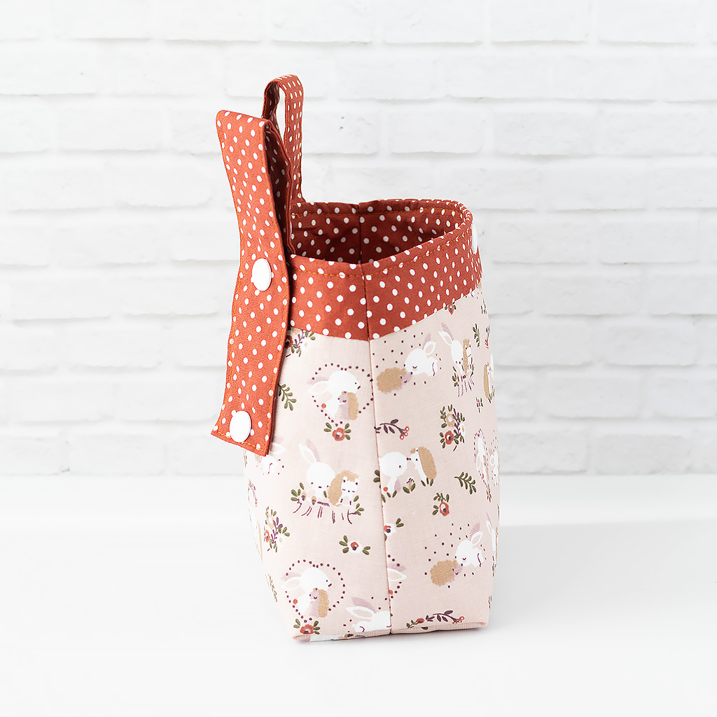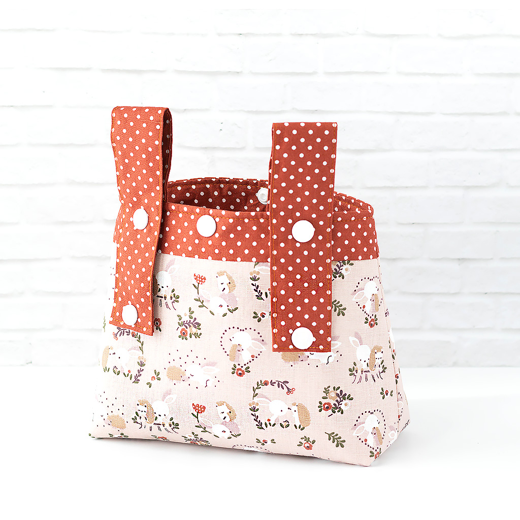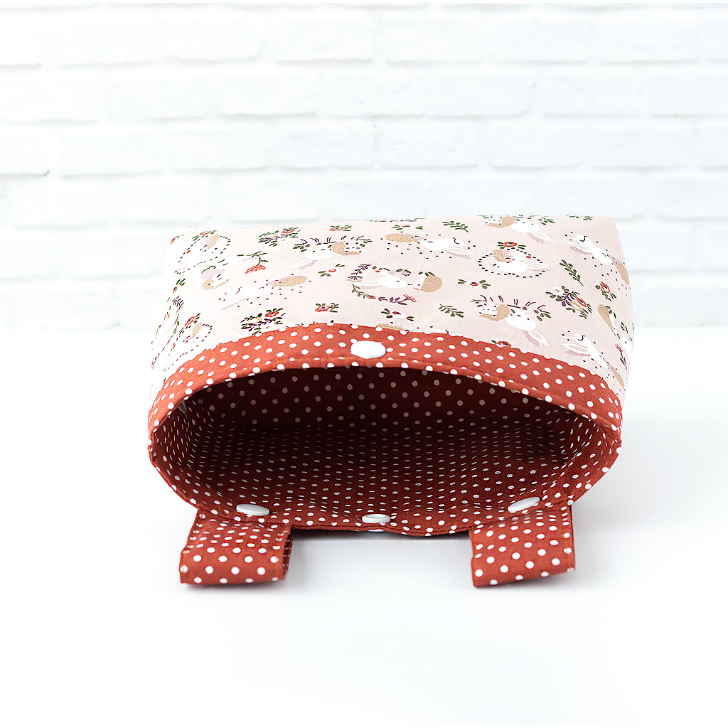 Stoff: Außenstoff: Hase und Igel auf hellem Braun, Innenstoff: hellbraun mit kleinen weißen Punkten