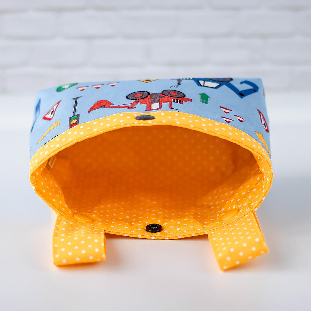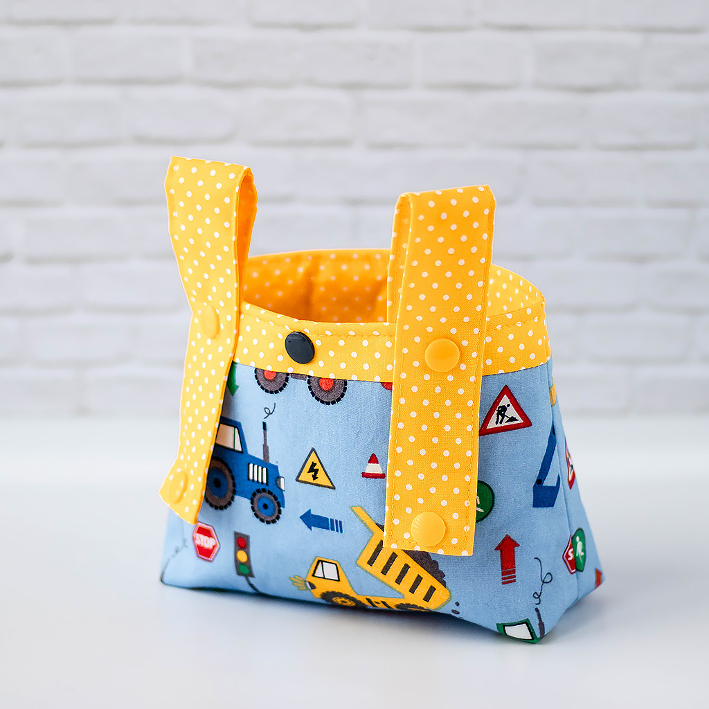 Lenkertasche aus 100 % Baumwolle mit blauem Baufahrzeug-Motiv. Praktischer Stauraum, sicher am Lenker befestigt und ideal für Laufrad, Roller oder Fahrrad. Unikat.