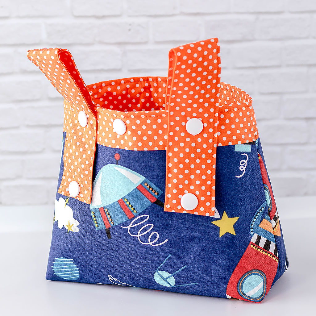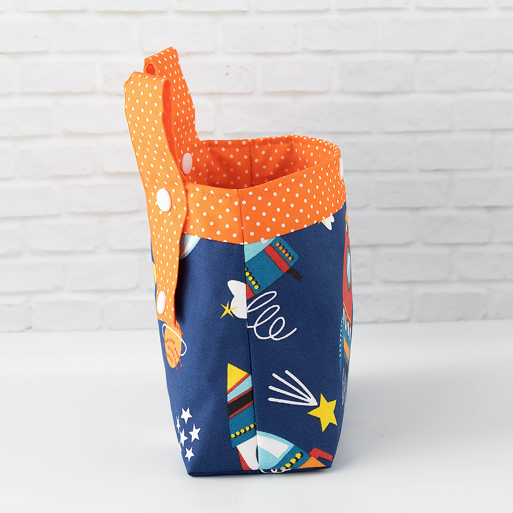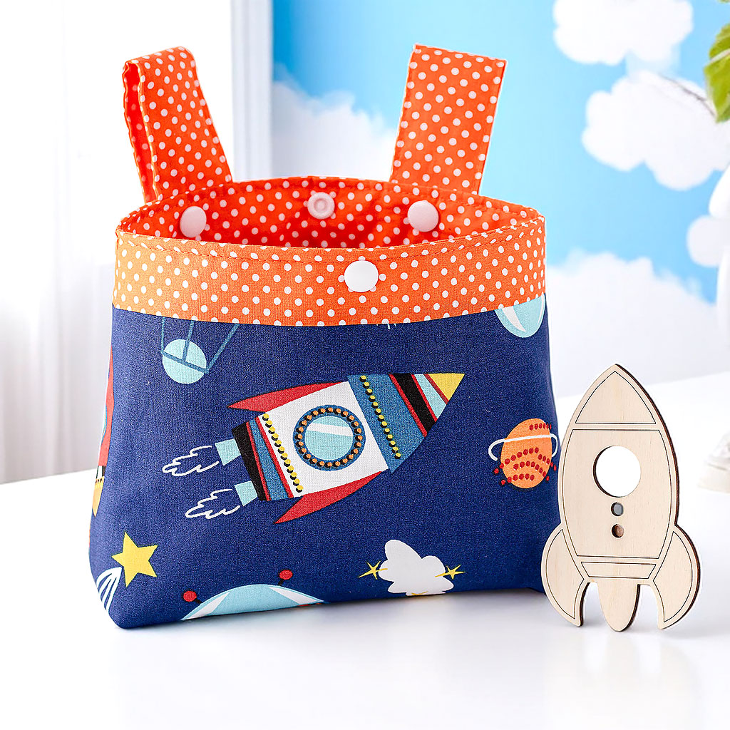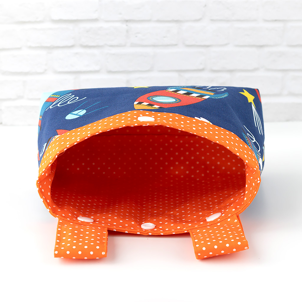 Diese handgemachte Lenkertasche aus robustem Baumwollstoff mit Raketenmotiv begleitet Kinder auf ihren täglichen Wegen.