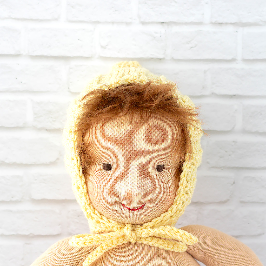 Pixiemütze und Schuhe für Waldorfpuppen aus Merinowolle – in Gelb oder Beere. Handgefertigt, atmungsaktiv und nachhaltig hergestellt.