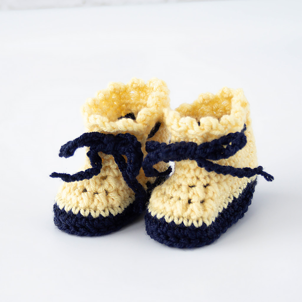 Die feine Merinowolle ist atmungsaktiv, temperaturausgleichend und angenehm weich – ideal auch für empfindliche Kinderhände. Die gehäkelten Schuhe mit Bindeband sitzen sicher und lassen sich leicht an- und ausziehen.