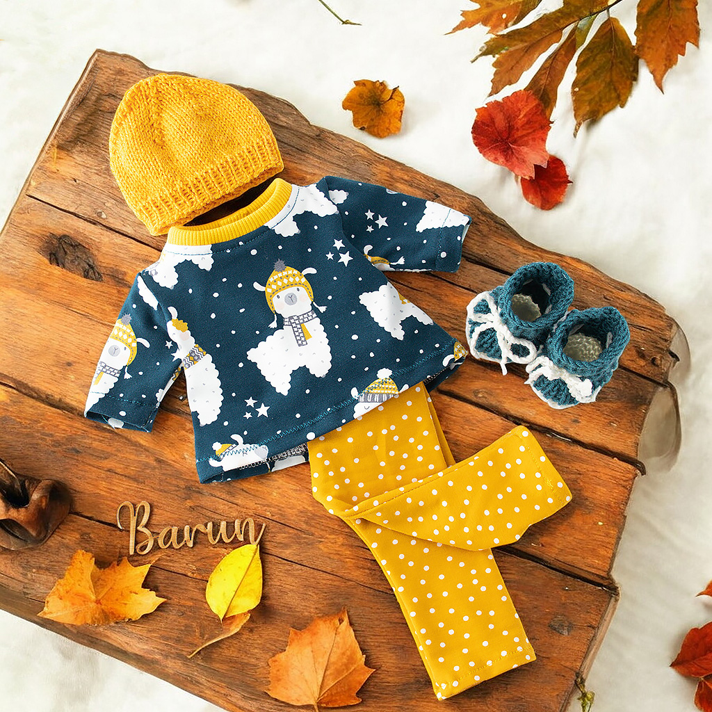 Hochwertiges Puppenkleidungs-Set für Waldorfpuppen und Puppen nach Art der Waldorfpuppe: Jersey-Pullover mit Lama-Motiv, gelbe Hose mit Punkten, Mütze und Stiefel aus Merinowolle. Robust, kindgerecht und ideal zum selbstständigen An- und Ausziehen – geeignet für Kinder ab 3 Jahren.