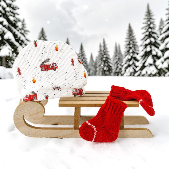 Hochwertiges Puppenset für 43 cm große Babypuppen: weiche Rip-Jersey-Mütze mit Feuerwehrmotiv kombiniert mit handgestrickten Socken aus Merinowolle – natürlich, wärmend und sorgfältig gefertigt.