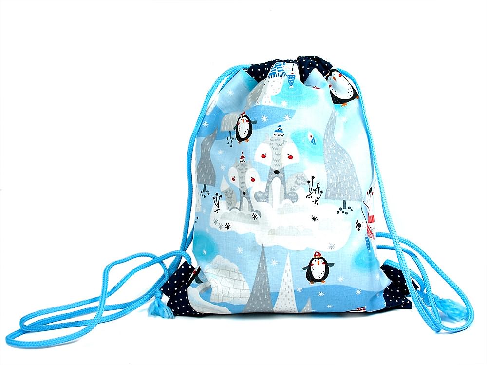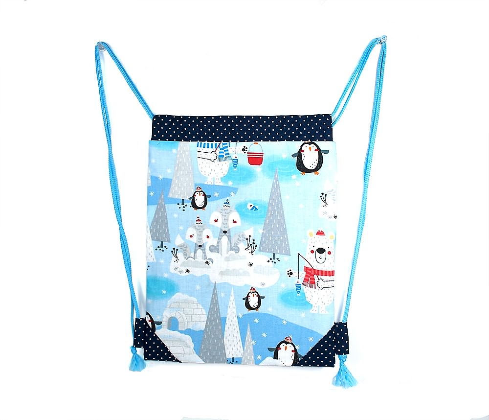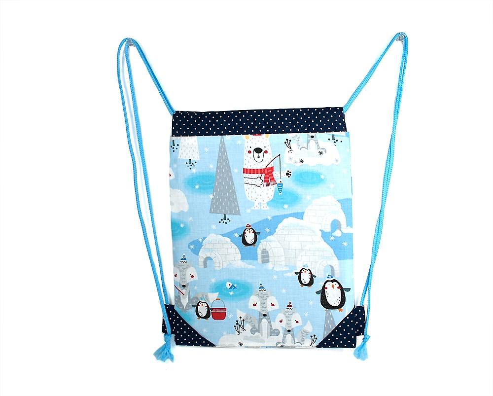 Kinder-Turnbeutel mit Eisbär, Pinguin und Wolf – winterlich schön, gefüttert und stabil. Ideal für Kindergarten, Spielzeug oder kleine Ausflüge.