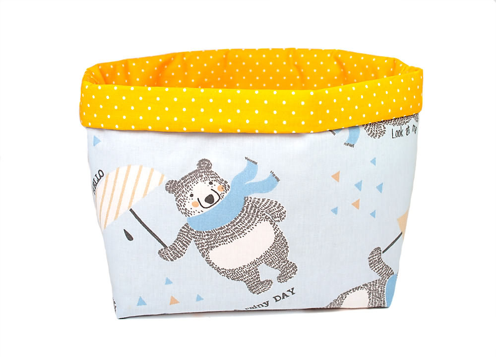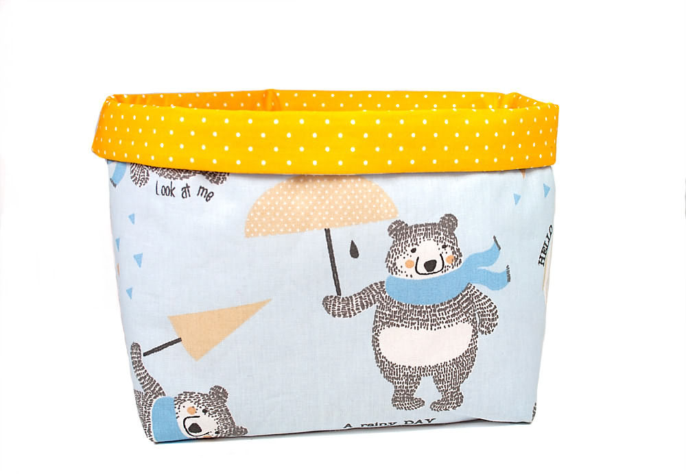 Niedliche Bären mit Schal und Schirm tummeln sich auf diesem Utensilo in fröhlichem Hellblau. Kombiniert mit sonnengelbem Stoff, bringt es Farbe und Ordnung ins Kinderzimmer. Ob Windeln, Pflegeutensilien oder Spielzeug – dieses Utensilo bietet vielfältigen Stauraum.